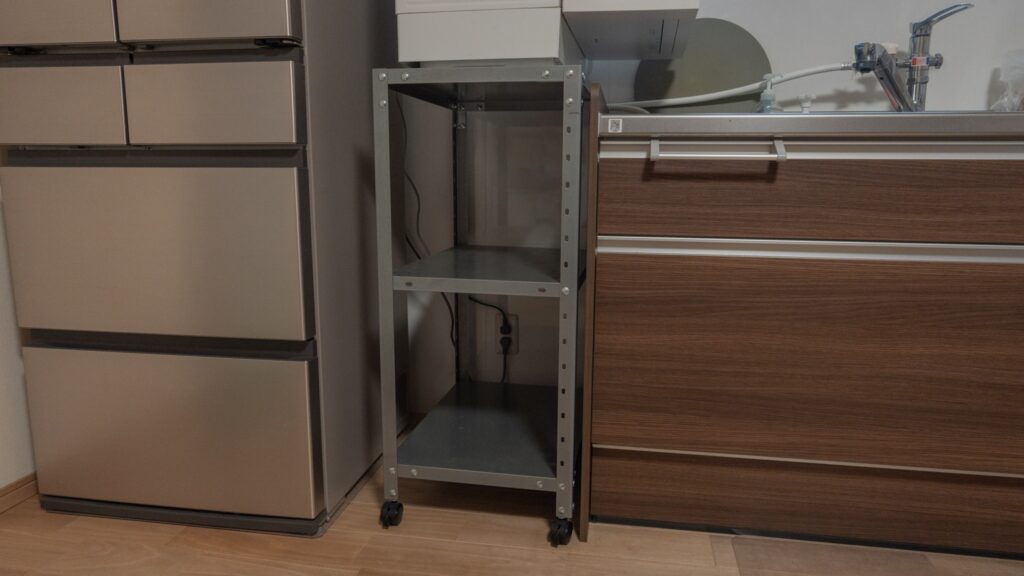 うちは戸建ての賃貸でキッチンがそれなりに広い。なのでキャスター付きスチールラック(カラー:亜鉛メッキ)を買って、流しのすぐ横に置ける形にした。今は軽く予洗いしてから食洗機に入れているので、流しの横にあるとずぐ入れられるので便利。