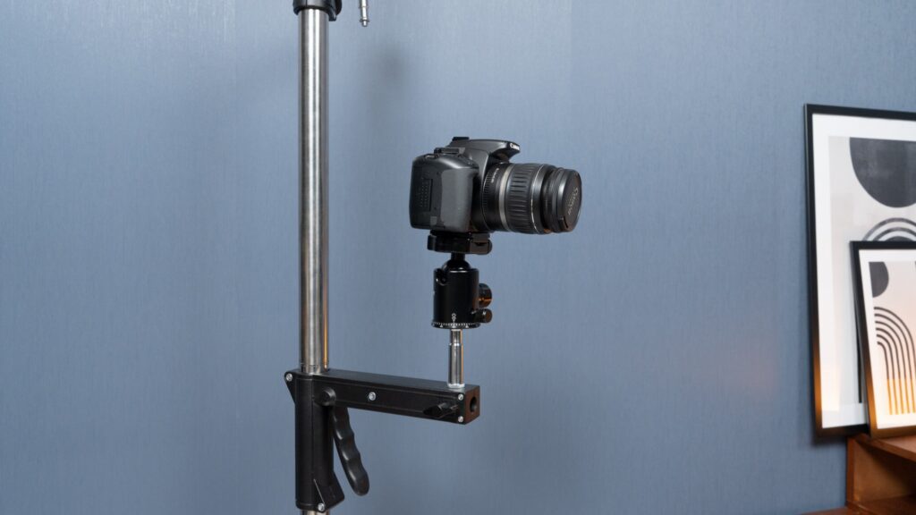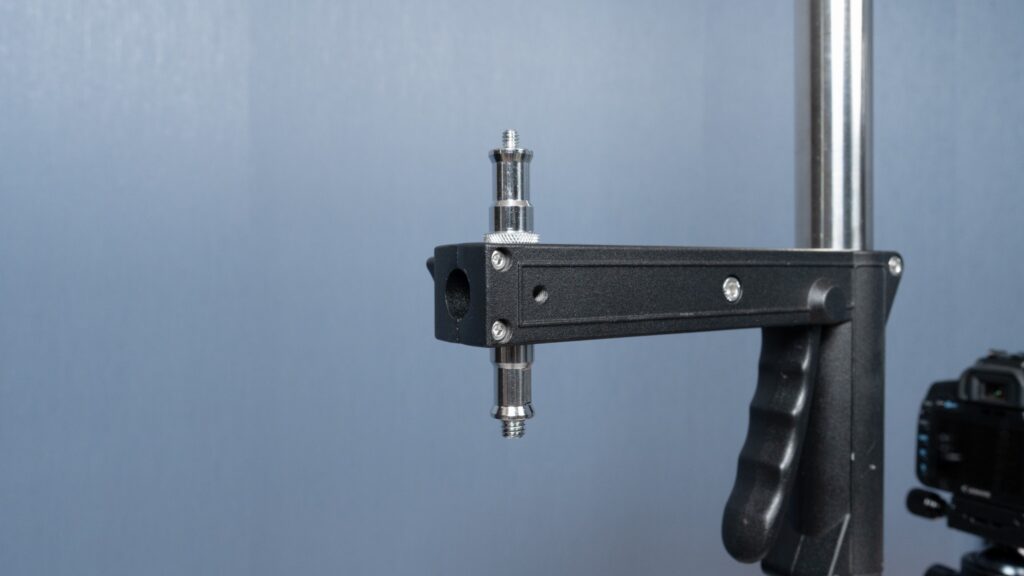 レバーを引っ張ると上下に移動できるハンドルがあり、先端のピンに照明機材だけでなくカメラの雲台も取り付け可能。